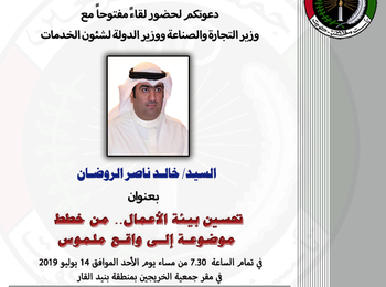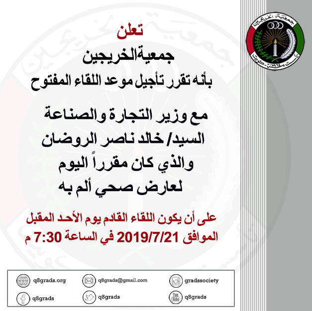 تعلن جمعية الخريجين بأنه تقرر تأجيل موعد اللقاء المفتوح مع وزير التجارة والصناعة السيد/ خالد ناصر الروضان