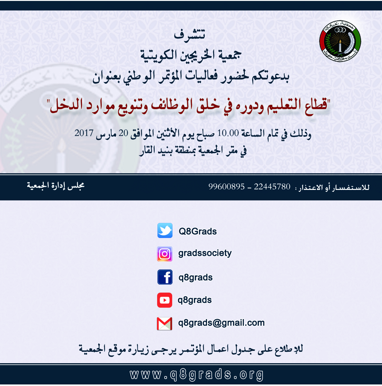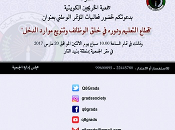 تقيم جميعة الخريجين الكويتية مؤتمرا يناقش دور القطاع التعليمي في خلق الوظائف وتنويع مصادر الدخل للدولة وذلك في صباح يوم الاثنين الموافق 20 مارس وستعقد ثلاث حلقات نقاشية في مقر الجمعية يشارك فيها ممثلين من الجهات الحكومية و أصحاب الأعمال القائمين على العمل التعليمي و آخرين.
