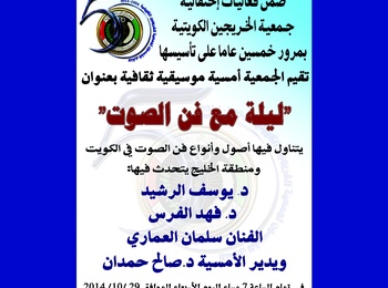 صباح الموسى (جريدة النهار) : ضمن فعاليات احتفالية مرور 50 عاما على تأسيس جمعية الخريجين أقامت جمعية الخريجين الكويتية أمسية موسيقية ثقافية بعنوان ليلة مع فن الصوت تناولت فيها اصول وأنواع فن الصوت في الكويت ومنطقة الخليج في قاعة الشهيد مبارك فالح النوت في جمعية الخريجين ببنيد القار، بحضور رئيس الجمعية سعود راشد العنزي ورئيس اللجنة الثقافية مشاري الحمود والفنان محمد المسباح. كما تخلل الاحتفالية أمسية ثقافية بعنوان ليلة فن الصوت تحدث فيها الدكتور يوسف الرشيد والدكتور فهد الفرس، وأدارها الدكتور صالح حمدان، الذي استهل الأمسية، مبرراً اختيار فن الصوت موضوعاً لها، بكونه الفن الرئيسي في الكويت والخليج العربي، مبدياً تذمره من غياب المسؤولين في المعهد العالي للفنون الموسيقية وكلية التربية الأساسية عن الأمسية.